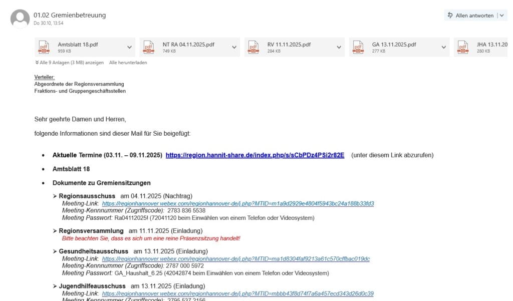 „Der Verwaltung und dem Regionspräsidenten ist sehr wohl bekannt, dass zeitgleich auch der Bundestag tagt. Mein Fraktionskollege Rocco Kever und ich sind daher in Berlin. Durch die Entscheidung für eine reine Präsenzsitzung wird uns nicht nur die Möglichkeit genommen, an wichtigen Wahlen teilzunehmen, sondern auch, unser Mandat auszuüben.“